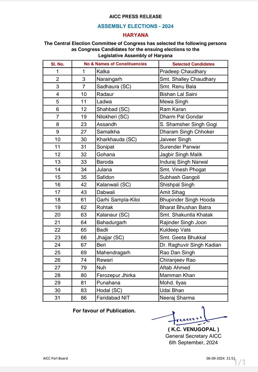 हरियाणा में कांग्रेस उम्मीदवारों की सूची जारी : पूरी लिस्ट देखें