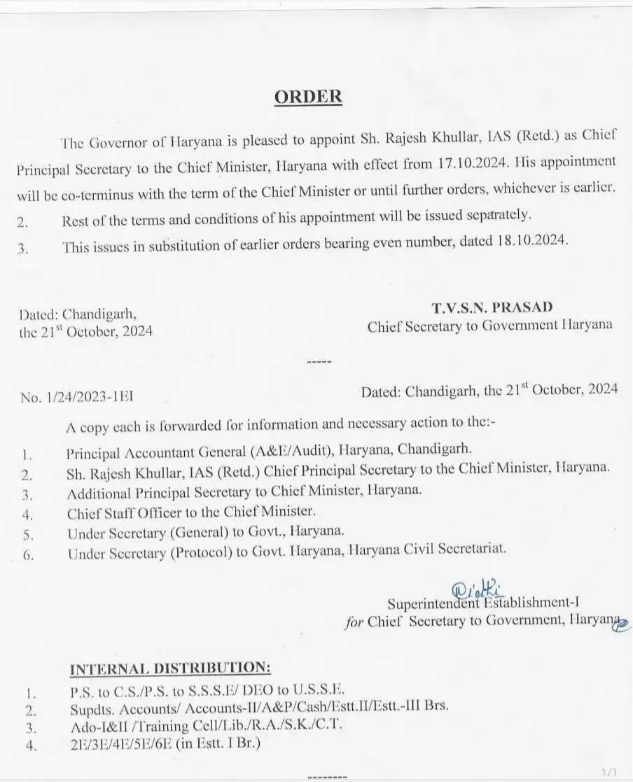हरियाणा में भाजपा की सरकार ने तीसरी बार पूर्ण बहुमत से सत्ता में आने के बाद प्रशासनिक स्तर पर कई महत्वपूर्ण कदम उठाने शुरू कर दिए हैं। इस क्रम में एक महत्वपूर्ण नियुक्ति की गई है, जिसमें पूर्व आईएएस अफसर राजेश खुल्लर को मुख्यमंत्री का मुख्य प्रधान सचिव नियुक्त किया गया है। यह निर्णय हरियाणा के मुख्य सचिव द्वारा जारी किए गए आदेशों के माध्यम से किया गया है, जिससे राज्य की प्रशासनिक ढांचे में एक नया परिवर्तन देखने को मिलेगा।